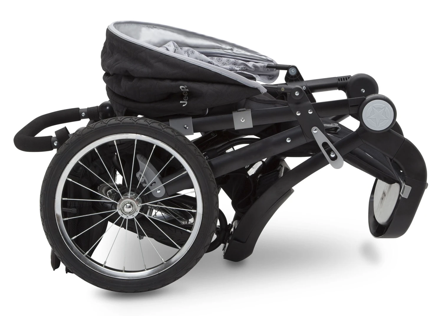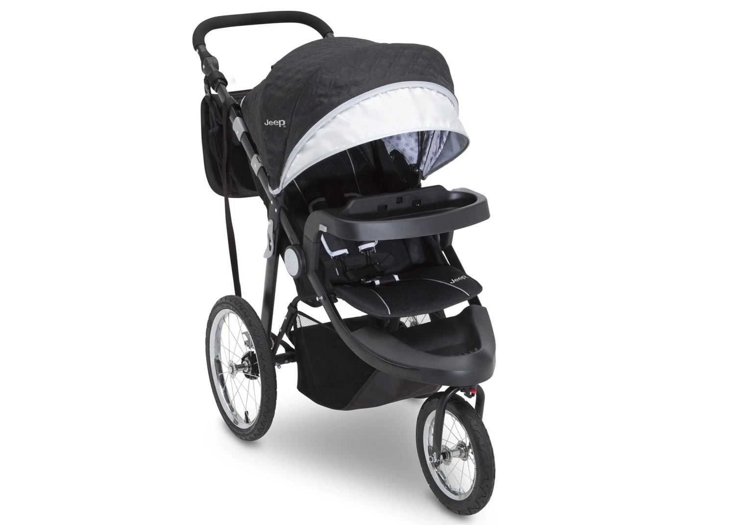 Travel, trek, wander or roam with the Jeep® Cross-Country Sport Plus Jogger. A versatile jogging stroller, it showcases how luxury and extreme capability combine to help you create unforgettable journeys with your child. Equipped with durable frame, front swivel wheel, and an extendable European canopy with sun visor and peek-a-boo window, it’s designed for parents and kids with an active lifestyle. Able to tackle the toughest trails, the Jeep® Cross-Country Sport Plus Jogger still has the little luxuries you expect from Jeep; the highest quality tech fabrics, air filled tires, reflective material for nighttime runs and a multi-position reclining seat with five-point safety harness with soft shoulder pads. Innovative materials, impressive value and cool features like the convenient fabric parent tray with covered phone storage and oversized detachable carryall parent organizer for all things baby adds up to create a groundbreaking jogging stroller that keeps you prepared for just about any occasion-no matter where the trail takes you and your little explorer.