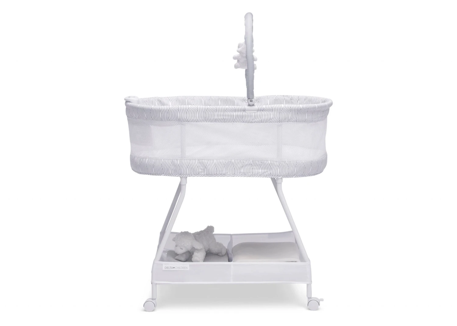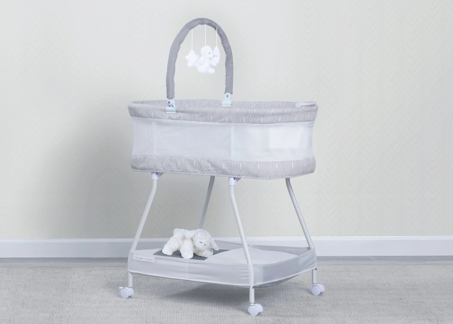 The Wave Bassinet by Delta Children is designed to help your little one fall asleep faster and stay asleep. This must-have bassinet features a control panel at the front with vibration, nightlight and soothing sounds to lull your newborn to sleep while mesh sides provide open airflow for breathability and a clear view of your baby. For your convenience, the adjustable toy bar provides entertainment if your baby wakes, lockable wheels make it easy to move around the house, and the easy-to-reach storage basket keeps changing essentials within reach. The Wave Bassinet by Delta Children is the easiest way stay safely connected and close to your baby during their first few months, and the modern wave print on the trim looks great in your master bedroom while room sharing or in your baby’s nursery. This bassinet is recommended for babies 0-5 months or up to 30lbs. Stop use at 5 months or once your infant begins to push up on their hands and knees, whichever comes first.