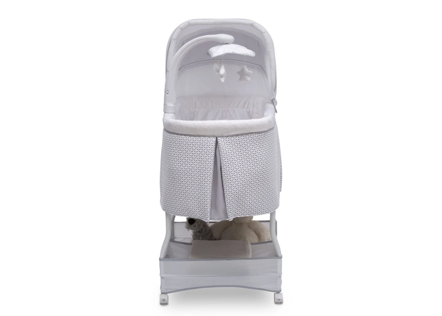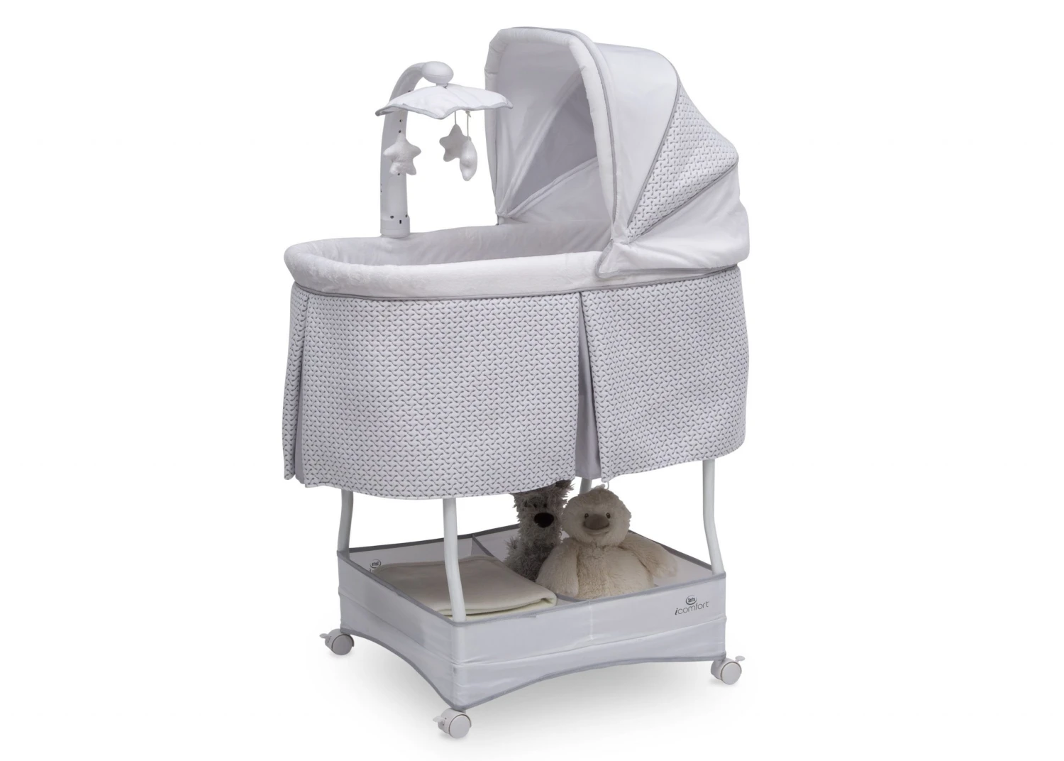 Help ease your baby to sleep with the automatic gliding motion, soothing sounds, spinning star toys, twinkling lights and soft-glow nightlight on the Serta iComfort Auto Gliding Bassinet. Activate the bassinet’s whisper-quiet gliding motion with a push of a button—the smooth sway creates a serene sleep space. The modern grey and white pattern on plush fabrics will be at home anywhere, from the nursery to the family room and the parents’ bedroom. Locking wheels, a light blocking canopy and foam mattress pad means your newborn can sleep by your side, no matter where you are in the house. Plus, the removable fitted sheet is machine washable for easy care. Brought to you by Serta, the leader in mattress innovation and technology, this bassinet will make it easier than ever for baby to fall asleep and stay asleep throughout the night. This bassinet is recommended for babies 0-5 months. Stop use at 5 months or once your infant begins to push up on their hands and knees, whichever comes first. Use the included AC adapter for battery free operation.