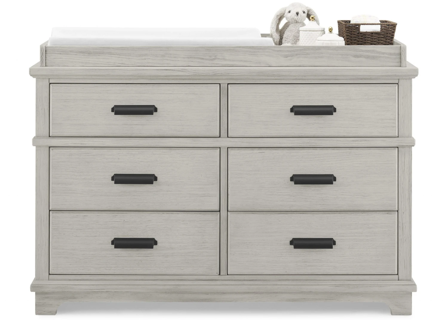 The Asher 6 Drawer Dresser with Changing Top by Simmons Kids adds modern farmhouse charm to any baby nursery or kids’ bedroom. A softy textured, hand applied finish and sleek matte black metal cup handles offer an updated take on rustic design. The Asher 6 Drawer Dresser includes a removable changing top that creates the perfect space for diaper changing now and is easily detachable, so you can create a more grown-up space later on. Pair this dresser with the Simmons Kids Asher 6-in-1 Convertible Crib for a coordinated look. Given the hand applied nature of this dresser’s finish, variations in the wood are to be expected and celebrated.