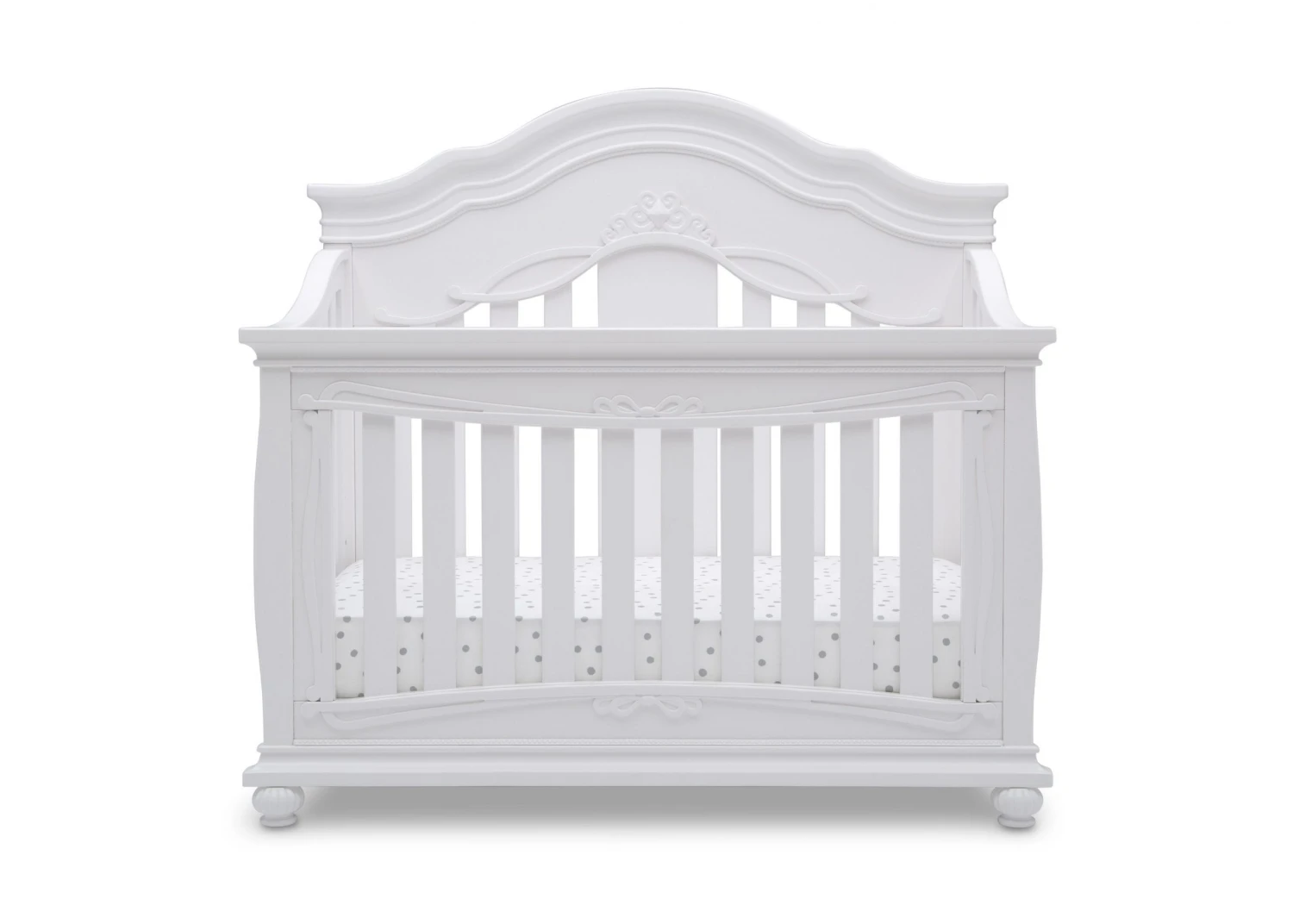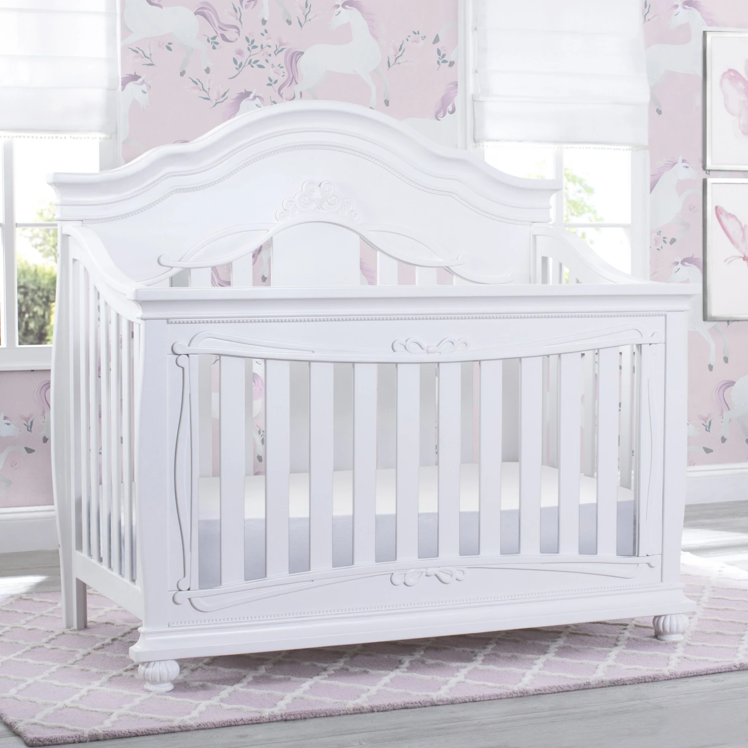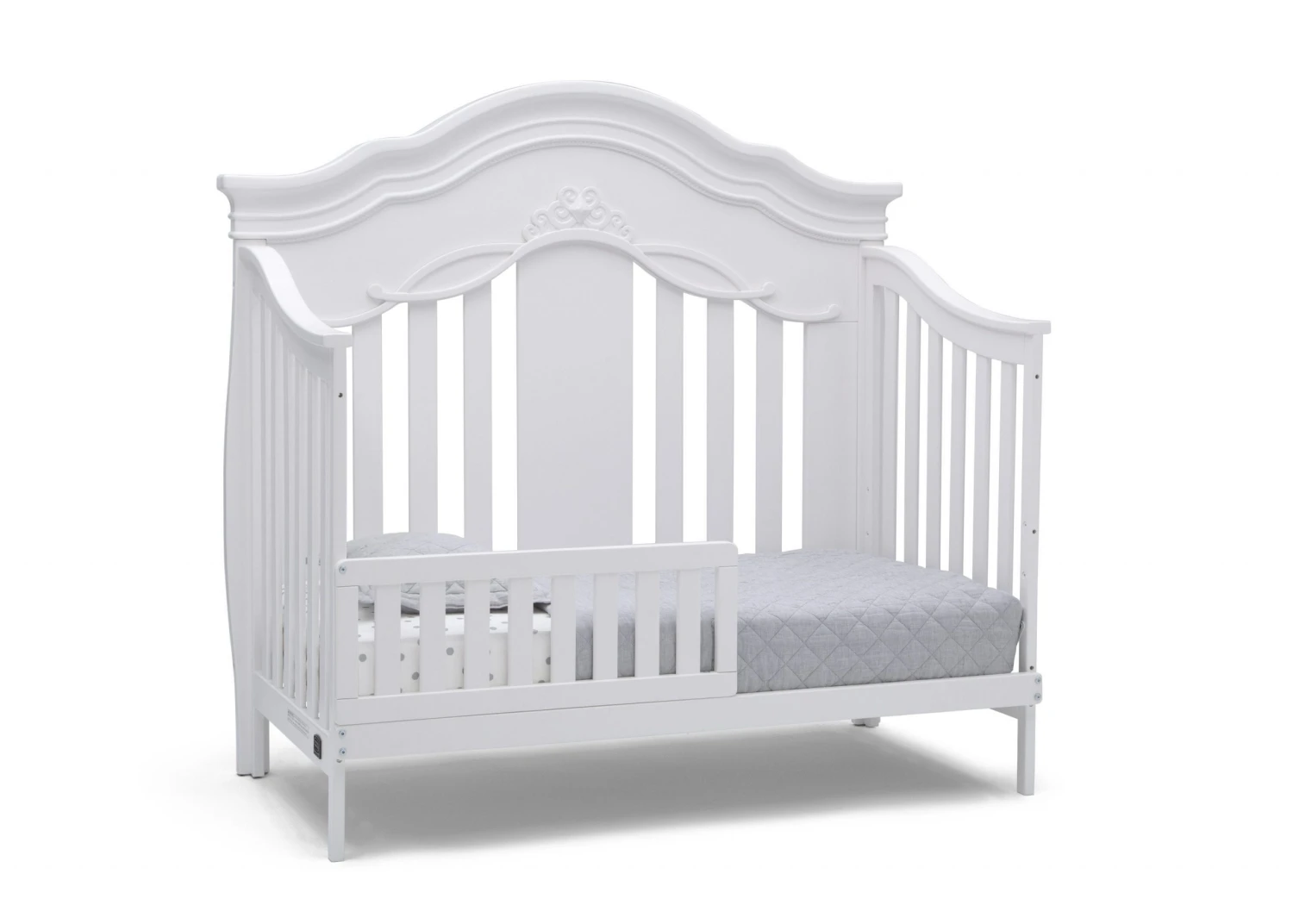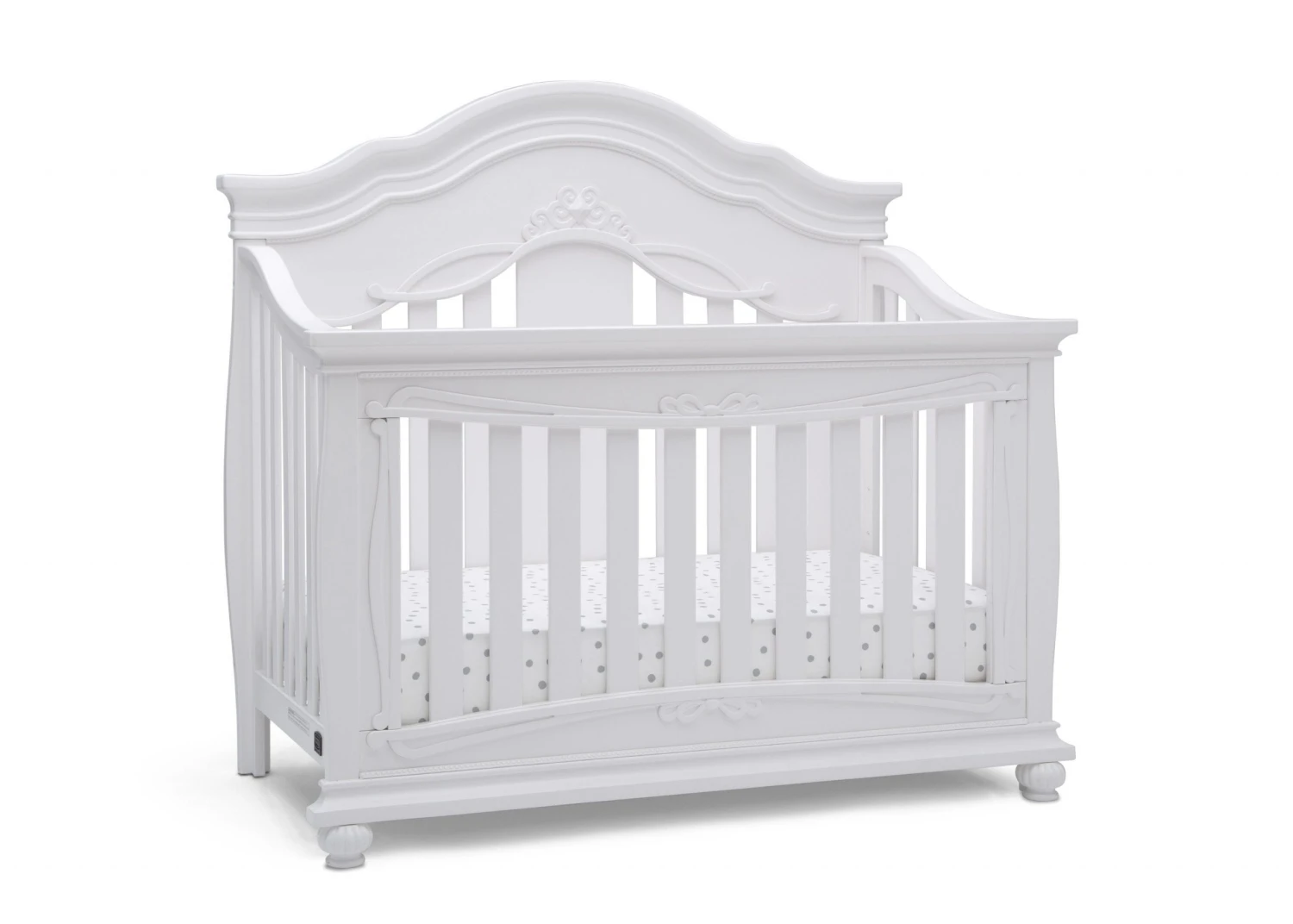 Give your nursery the royal treatment with the Fairytale 5-in-1 Convertible Crib with Conversion Rails by Simmons Kids. Full of enchanting details, like a scalloped silhouette, intricate princess-inspired carvings and bun feet, this baby crib adds sophisticated style to any bedroom. Designed to grow with your little princess, it features three adjustable mattress positions, and (magically!) transforms into a toddler bed, daybed, sofa and full size bed. For your convenience, all of the conversion rails are included with this crib which easily allows you to adapt to each stage of your child’s life. To complete your nursery, pair the Fairytale 5-in-1 Convertible Crib with coordinating items from the Simmons Kids Fairytale Collection.