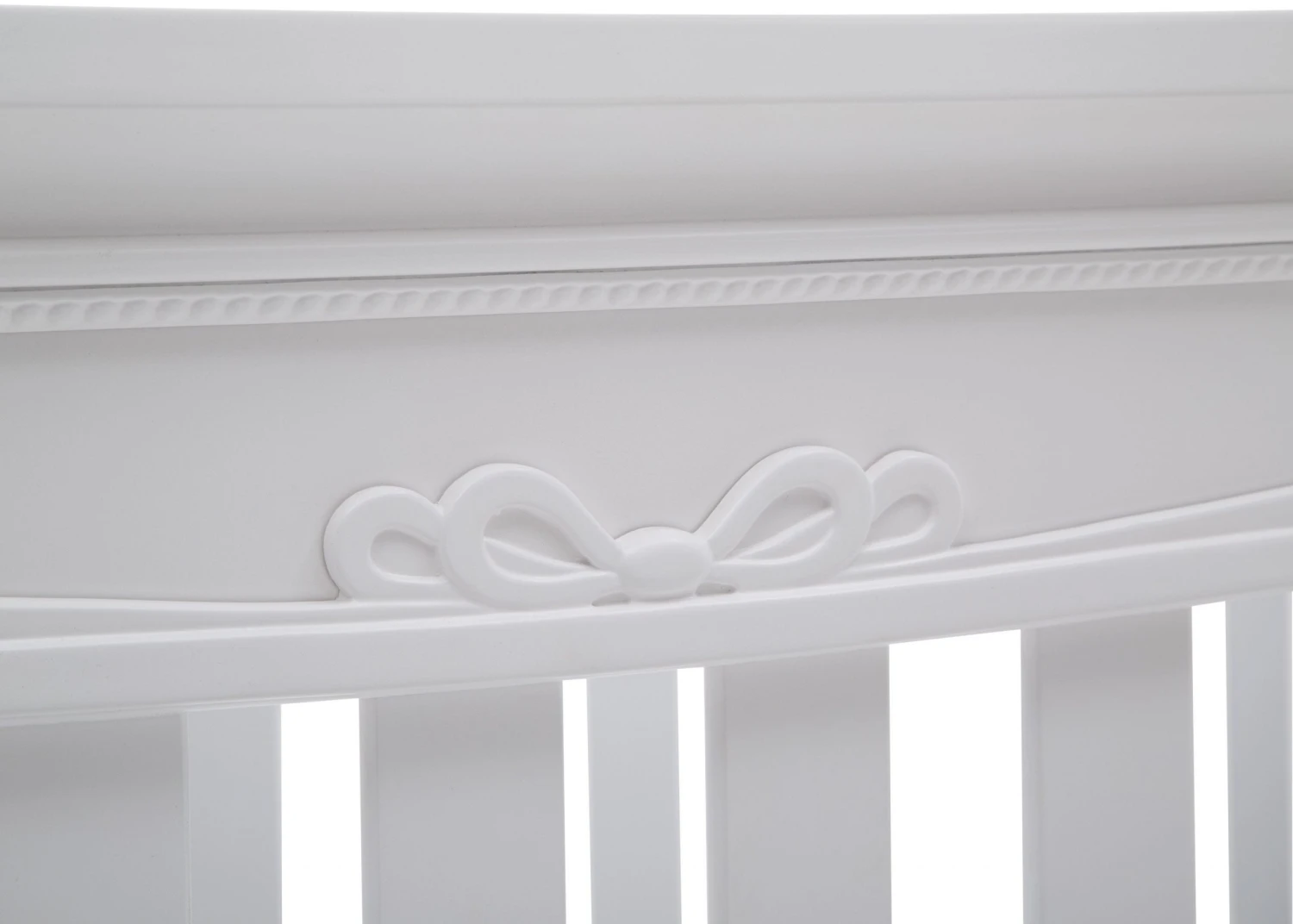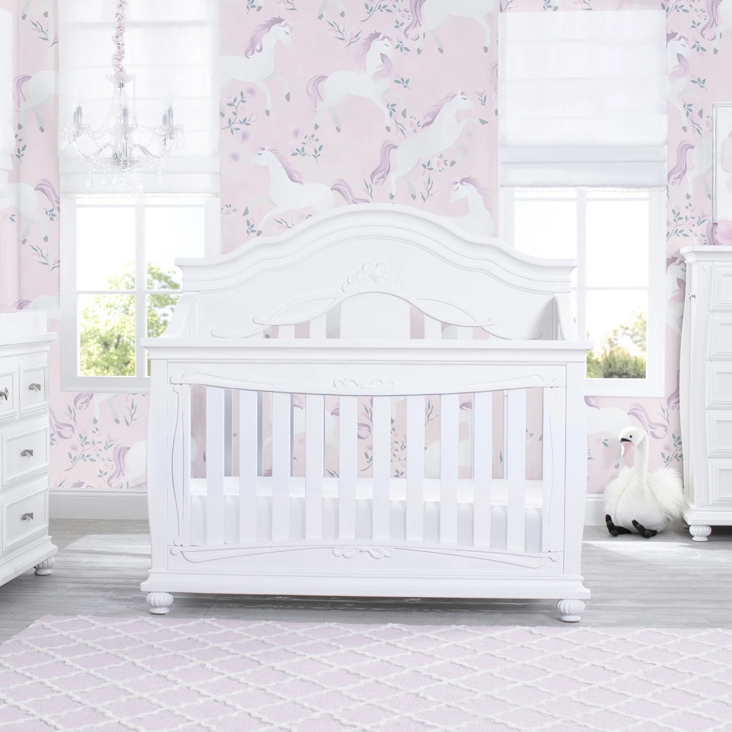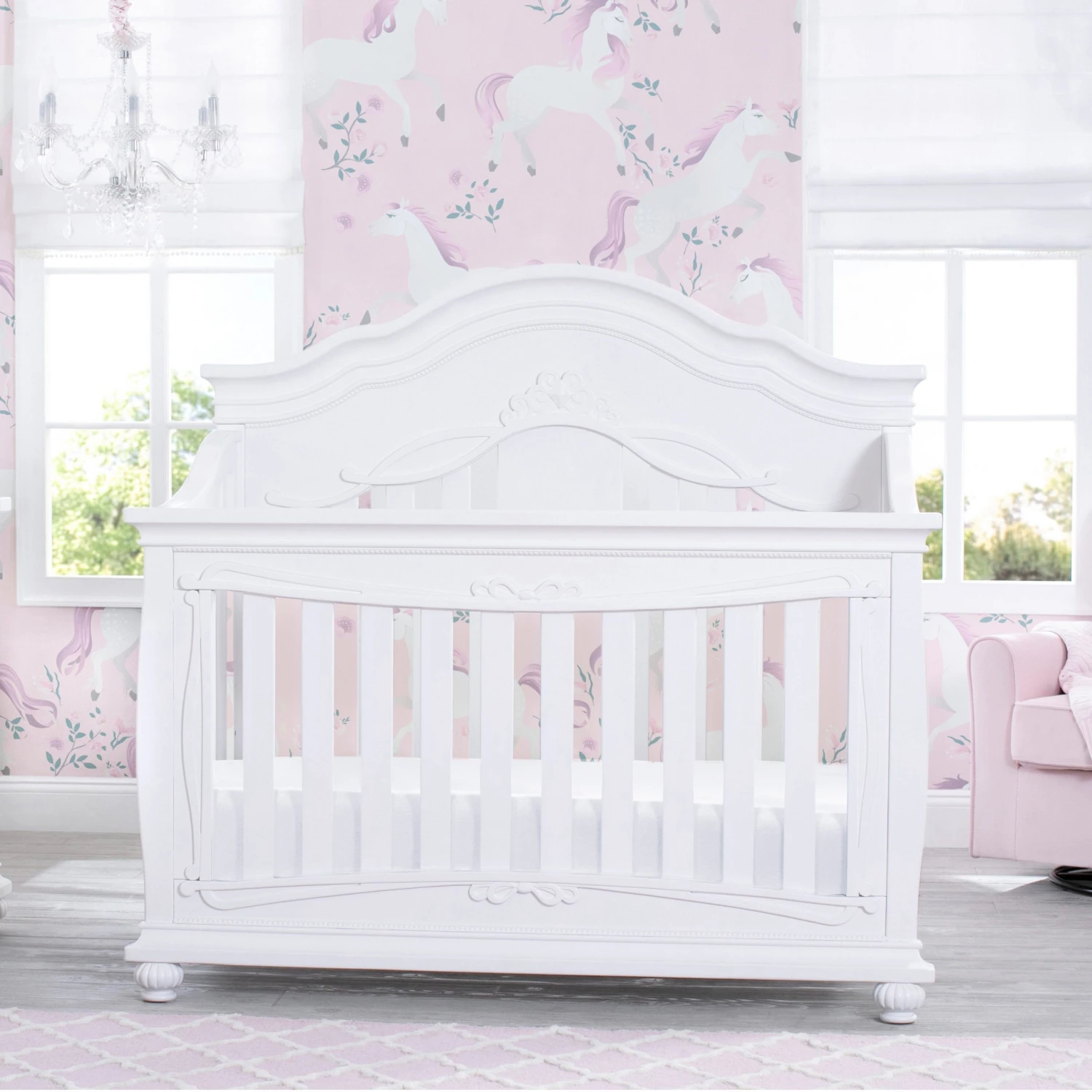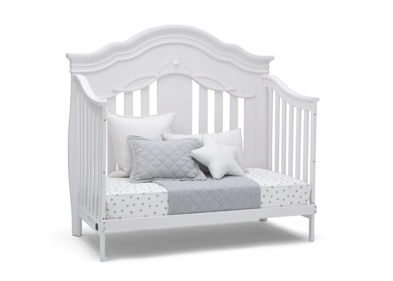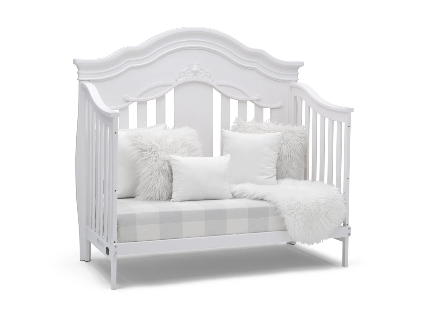 Give your nursery the royal treatment with the Fairytale 5-in-1 Convertible Crib with Conversion Rails by Simmons Kids. Full of enchanting details, like a scalloped silhouette, intricate princess-inspired carvings and bun feet, this baby crib adds sophisticated style to any bedroom. Designed to grow with your little princess, it features three adjustable mattress positions, and (magically!) transforms into a toddler bed, daybed, sofa and full size bed. For your convenience, all of the conversion rails are included with this crib which easily allows you to adapt to each stage of your child’s life. To complete your nursery, pair the Fairytale 5-in-1 Convertible Crib with coordinating items from the Simmons Kids Fairytale Collection.