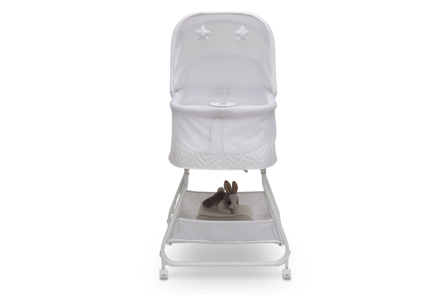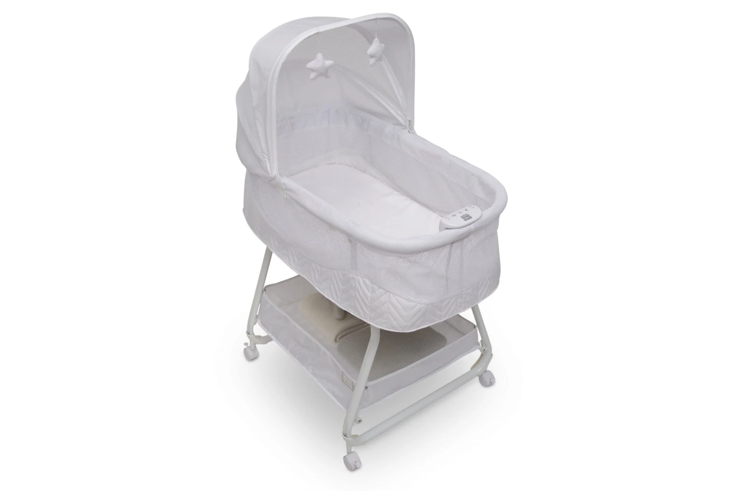 The Simmons Kids Airflow Auto Motion Bassinet is a modern close-to-the bed sleeper that boasts tons of calming and convenient features! Designed to help your baby fall asleep faster and stay asleep longer, the hands-free auto-glide motion helps soothe your baby—choose from two speeds that run for 60-minute intervals. The attached electronic pod features a soft nightlight and eight music and sound options that you and your baby will love. Breathable mesh sides all around provide increased airflow and a clear view of your sleeping baby while the adjustable canopy blocks light during naptime. Hanging plush stars on the canopy will engage and delight your baby if they wake up in the middle of the night. Other stand-out features include: large storage basket, comfortable 1-inch waterproof mattress pad with machine washable fitted sheet and wheels that make it easy to move around the house. This bassinet is recommended for babies 0-5 months. Max weight 30 lbs. Stop use at 5 months or once your infant begins to push up on their hands and knees, whichever comes first.