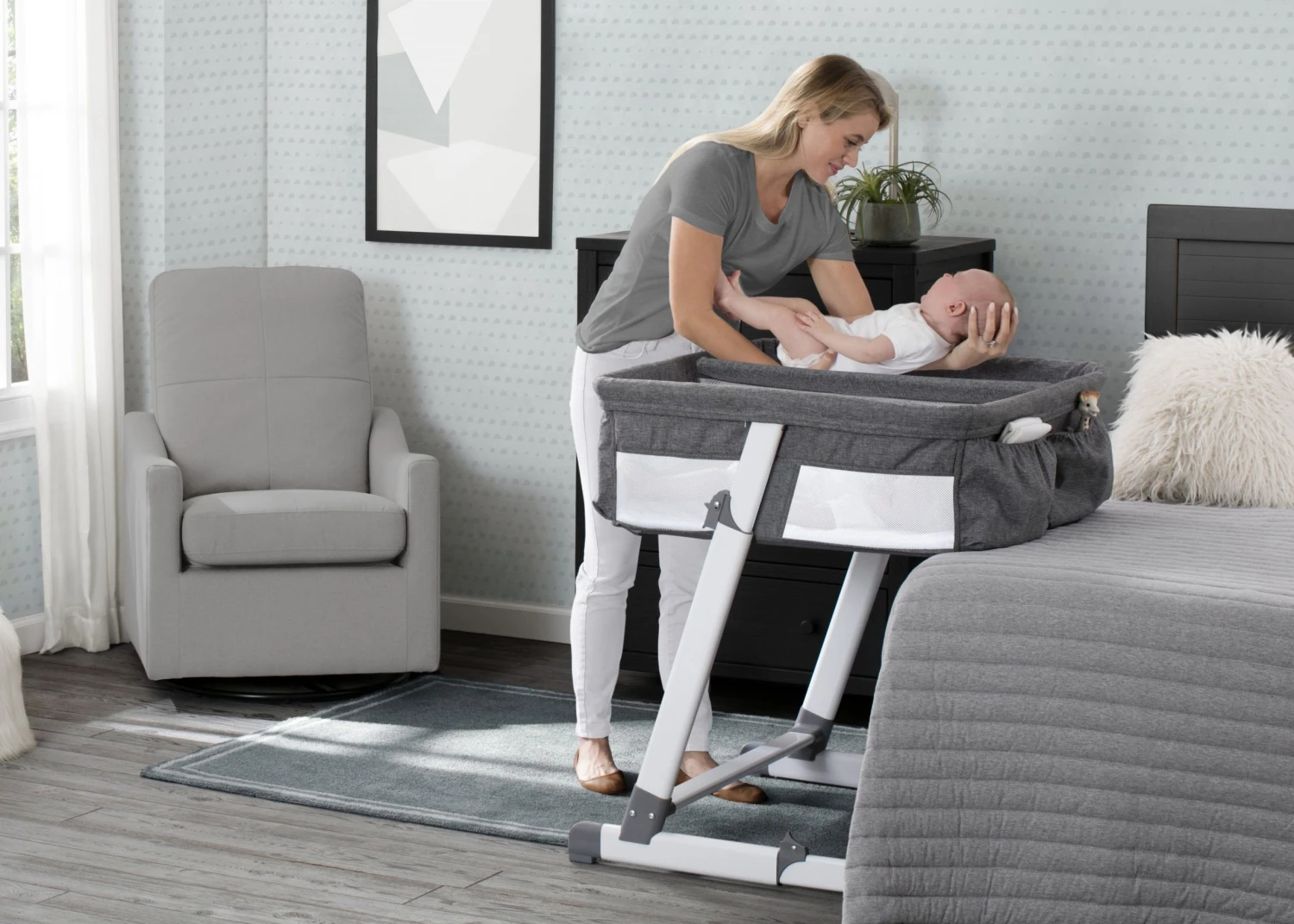 Keep your newborn twins close with the Simmons Kids By the Bed Twin City Sleeper Bassinet. The bassinet’s modern z-shaped frame is outfitted with wheels, so you can easily slide the base under your bed giving your babies a safe, separate sleep space that’s still close to you (and each other!). Perfect for all mothers (especially those who are breast feeding or recovering from C-sections), this bassinet’s sturdy, adjustable base with five height levels fits next to almost any bed, and keeps your baby at eye level, so you can easily soothe and tend to them during their first few months. Mesh sides provide a clear view and help with airflow. For your ease, storage pockets provide space for burp clothes, small toys or pacifiers. The twin bedside sleeper of your dreams, the Simmons Kids By the Bed Twin City Sleeper Bassinet allows you to feel close and connected to your little ones in the safest way possible. This bassinet is recommended for babies 0-5 months. Stop use at 5 months or once your infant begins to push up on their hands and knees, whichever comes first.