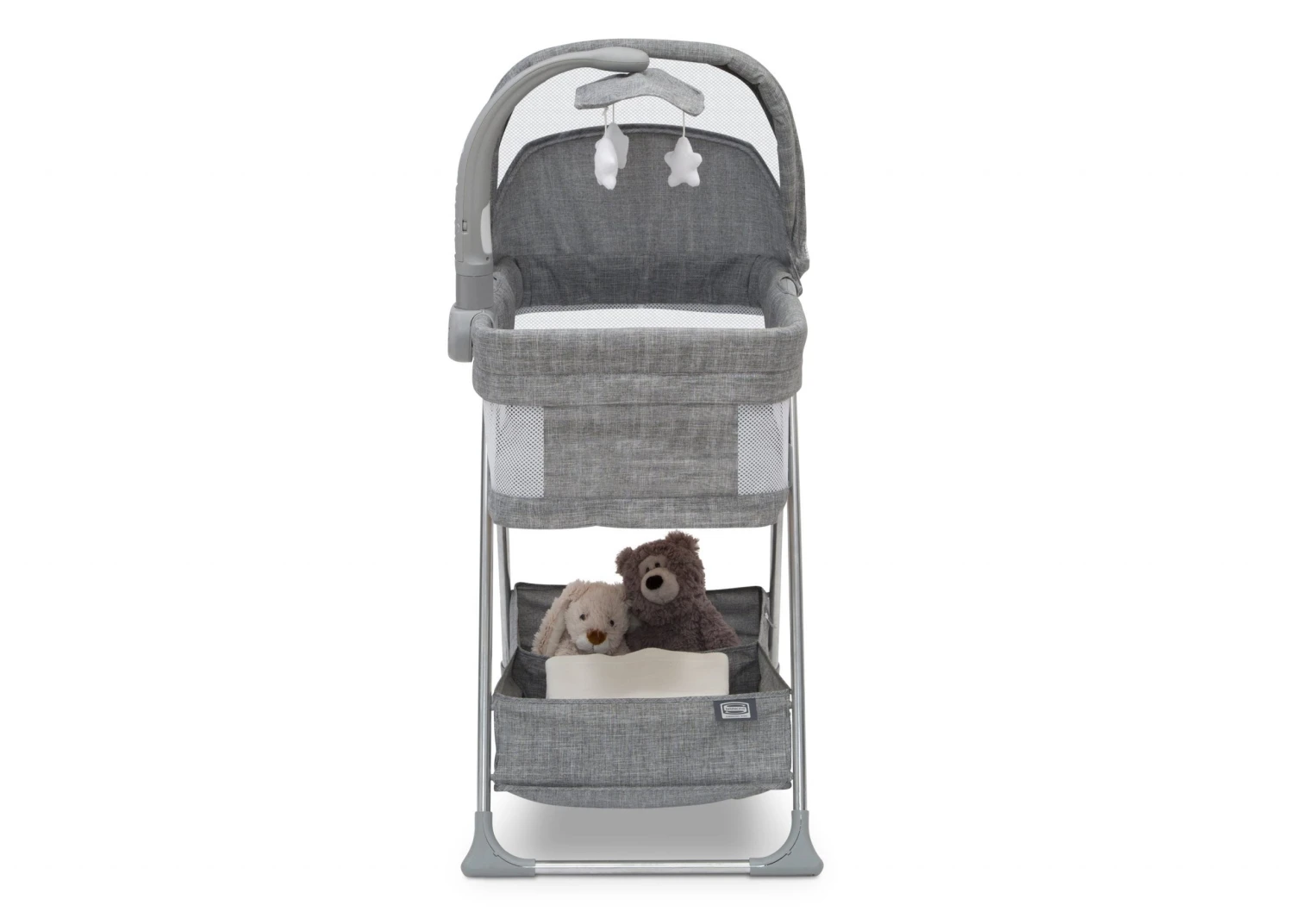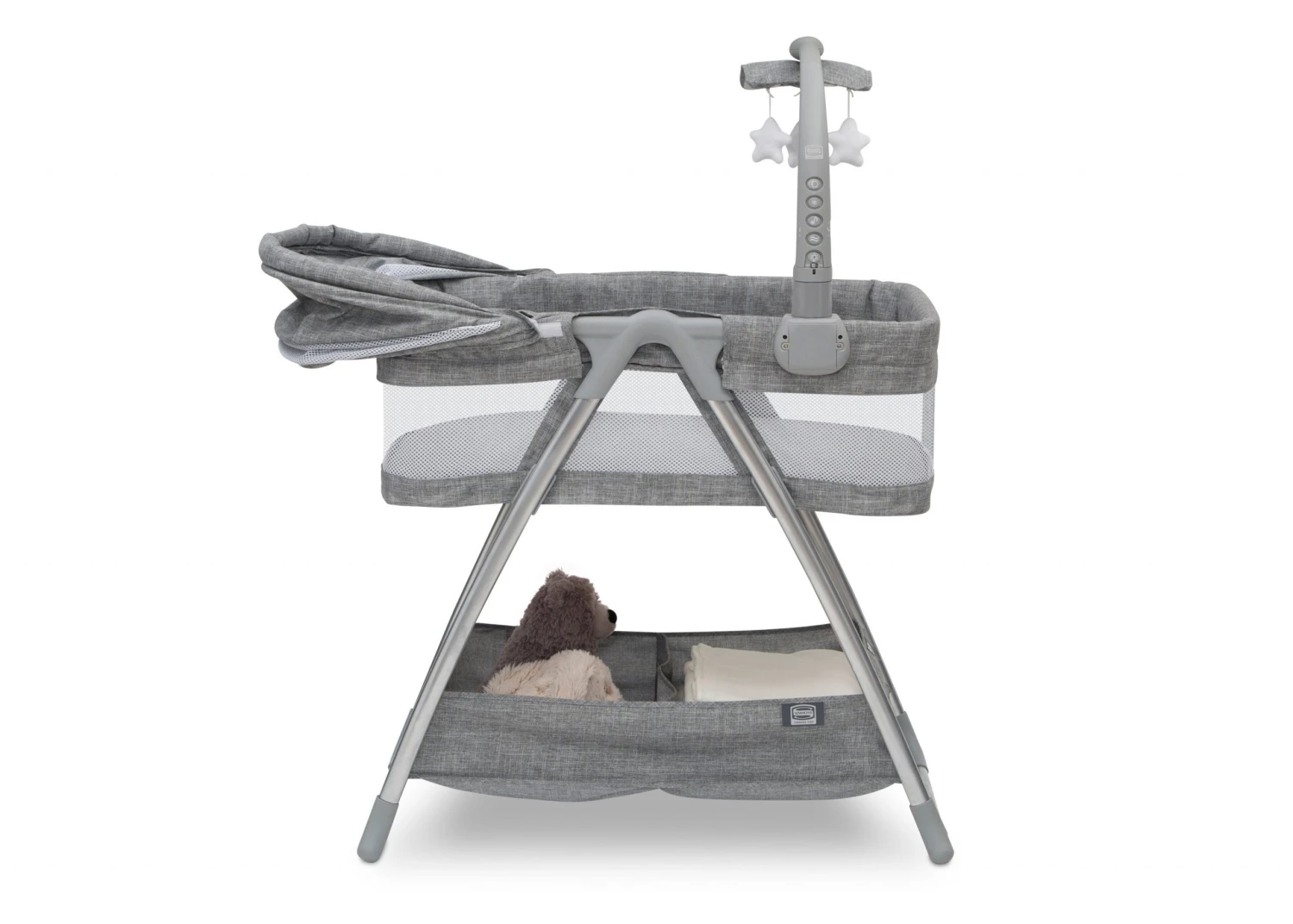 With a cool, contemporary style enhanced by high-tech features for your little trendsetter, the City Sleeper Bassinet by Simmons Kids is a perfect choice for your baby. A heathered grey tweed pattern adds a hip, stylish touch to this cozy infant bassinet. Providing a soothing sleep environment for baby, the sophisticated features of the attached electronic mobile include a nightlight, vibrations and twinkle lights to help lull your little one to sleep. Dangling plush stars that rotate add a dose of extra sweetness. Breathable mesh on the adjustable and removable canopy ensures healthy air flow and ventilation. A generously sized storage basket underneath the frame makes it easy to access all of your baby essentials. Your baby will sleep safe and sound, in style with the City Sleeper Bassinet.