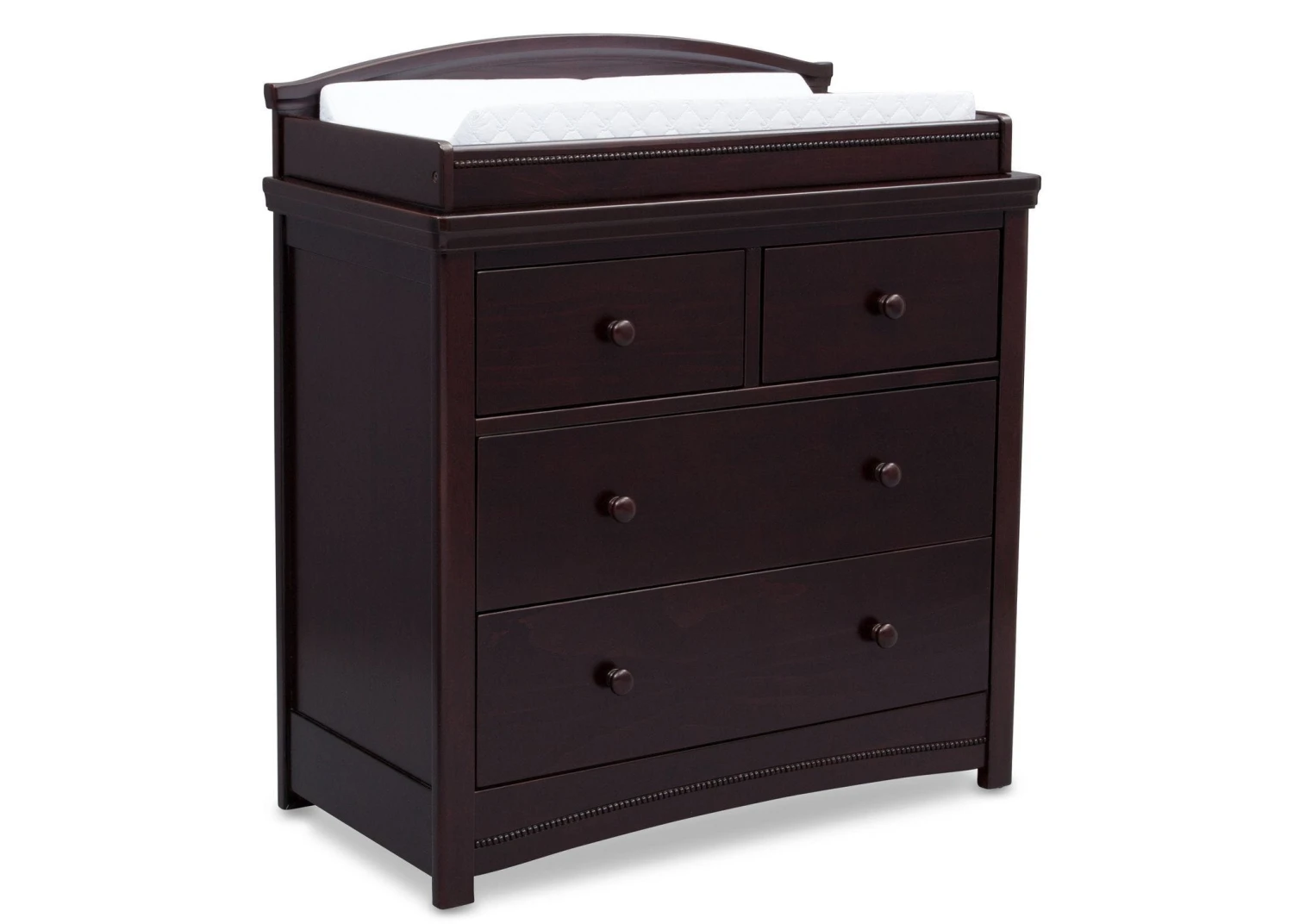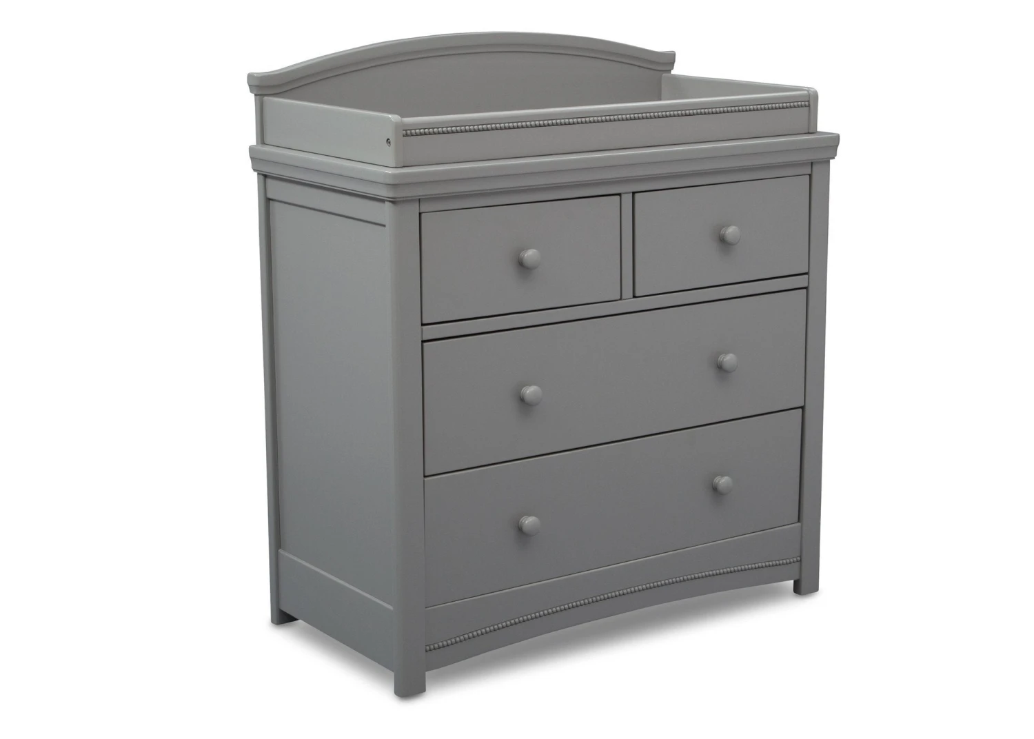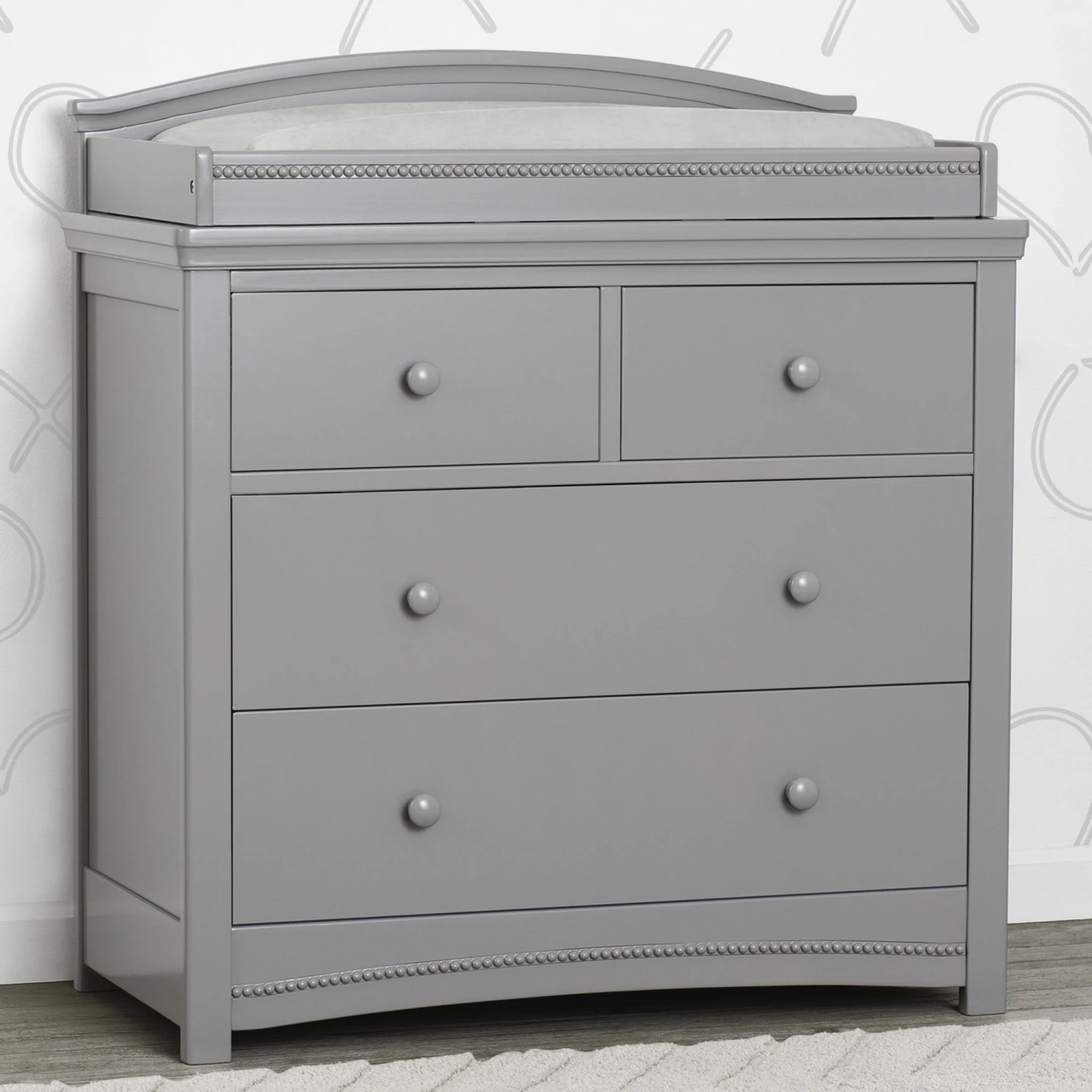 Endlessly useful and extra sturdy, the Emma 4 Drawer Dresser with Changing Top is a smart and stylish storage option for your nursery. Ample storage space keeps growing wardrobes organized while the removable topper makes changing time easy. Pretty details and smart safety features mean that this dresser will be a fixture in your child’s room for years to come