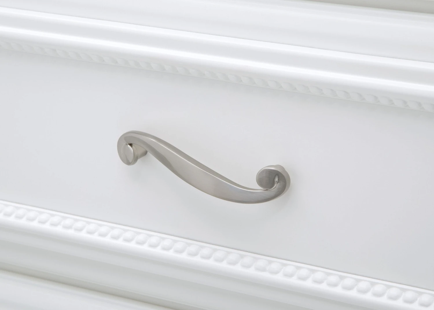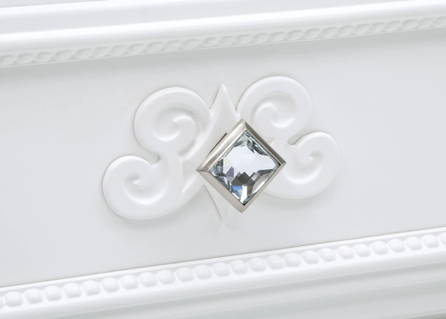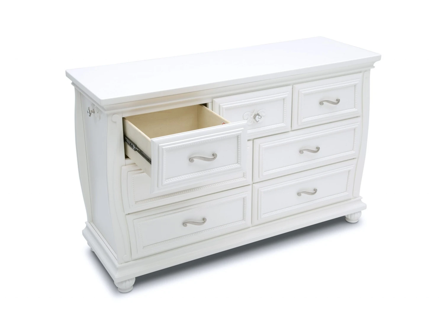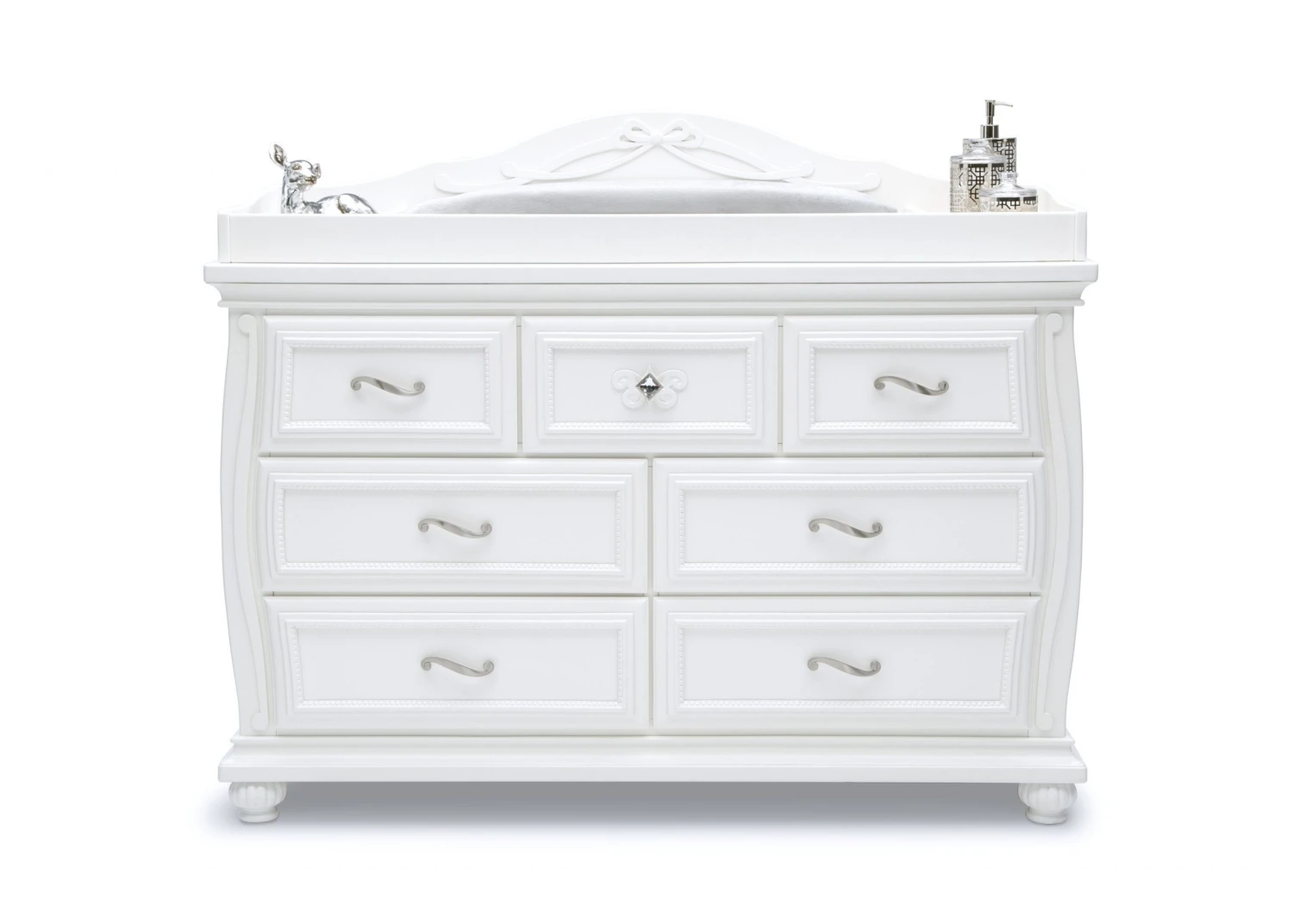 The Fairytale 7 Drawer Dresser with Changing Top will be the crown jewel of any bedroom. Seven sliding drawers with satin nickel pulls open to reveal a wealth of storage within. Acrylic knobs on each side of the dresser provide additional storage space to hang changing accessories, like towels or burp clothes. The included changing top provides a convenient and safe place to dress or change your baby’s diapers—and its felt lined bottom protects the dresser’s surface. Remove the changing top once your child outgrows the needs for a changing table