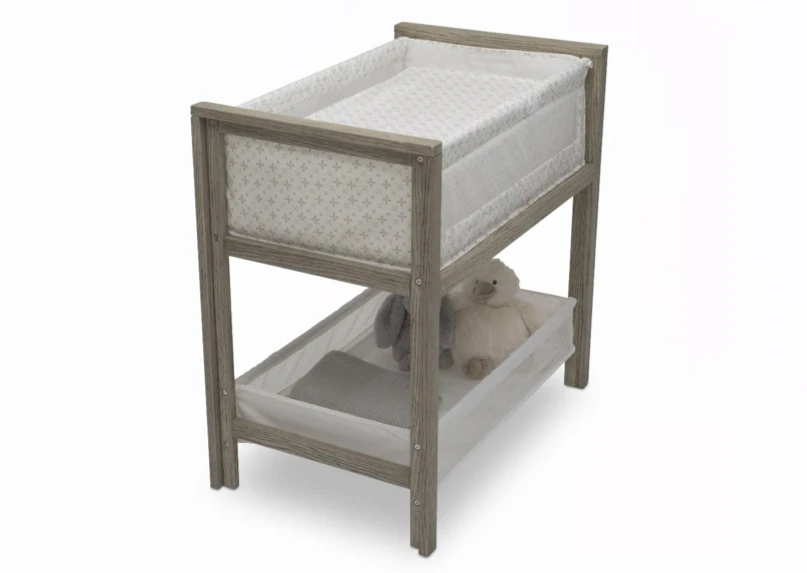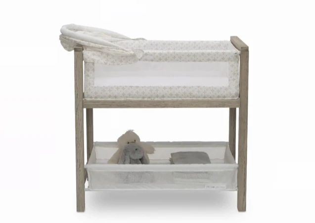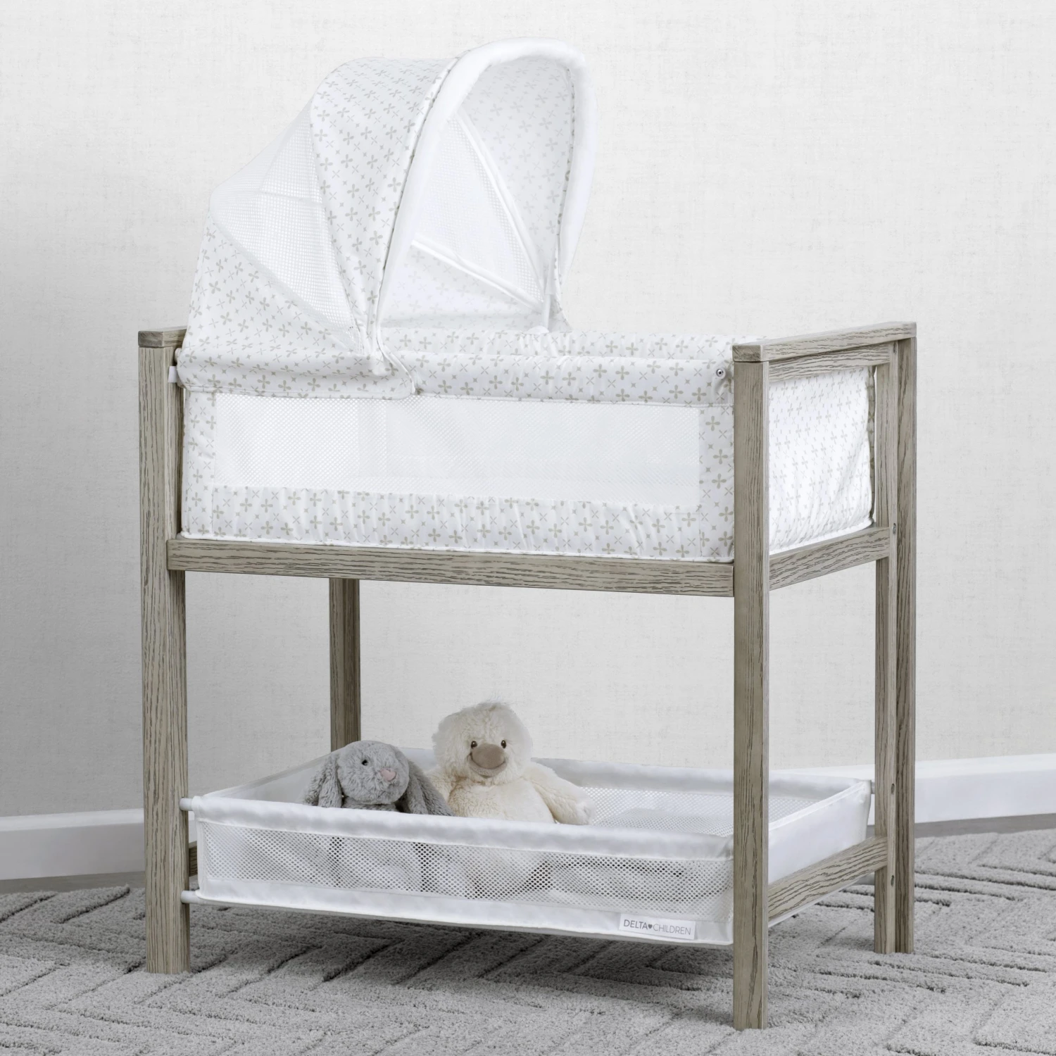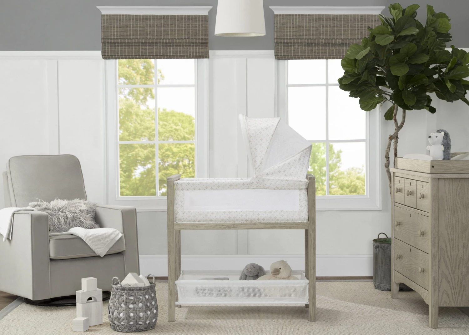 The Farmhouse 2-in-1 Wood Bedside Bassinet Sleeper and Changer by Simmons Kids is the ultimate multi-tasker. A great option for smaller nurseries, your master bedroom or grandparents’ house, it features a solid wood frame and legs with textured finish that is hand applied. Its convertible design can be used as bassinet that allows you to keep baby safely by your bedside and adapts to a changing table by simply adding the provided changing top. The mesh sides allow generous airflow, while the adjustable/removable canopy helps diffuse light to create a dimmer sleeping environment during the day. Lightweight enough to be easily moved from room to room, you can use this bassinet and changing table combo anywhere in the house. The Farmhouse 2-in-1 Wood Bedside Bassinet Sleeper and Changer is a rustic retreat that grows with your baby. Pair this bassinet with other items from the Delta Children Farmhouse Collection for the perfect rustic-inspired nursery. Recommended for babies 0-5 months. Max weight 30 lbs. Stop use at 5 months or once your infant begins to push up on their hands and knees, whichever comes first.