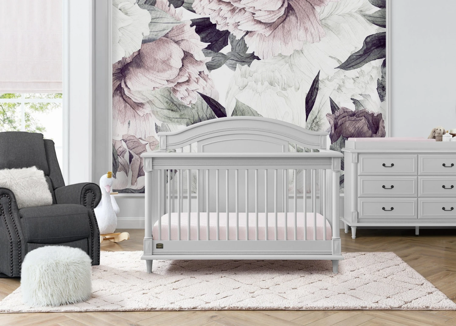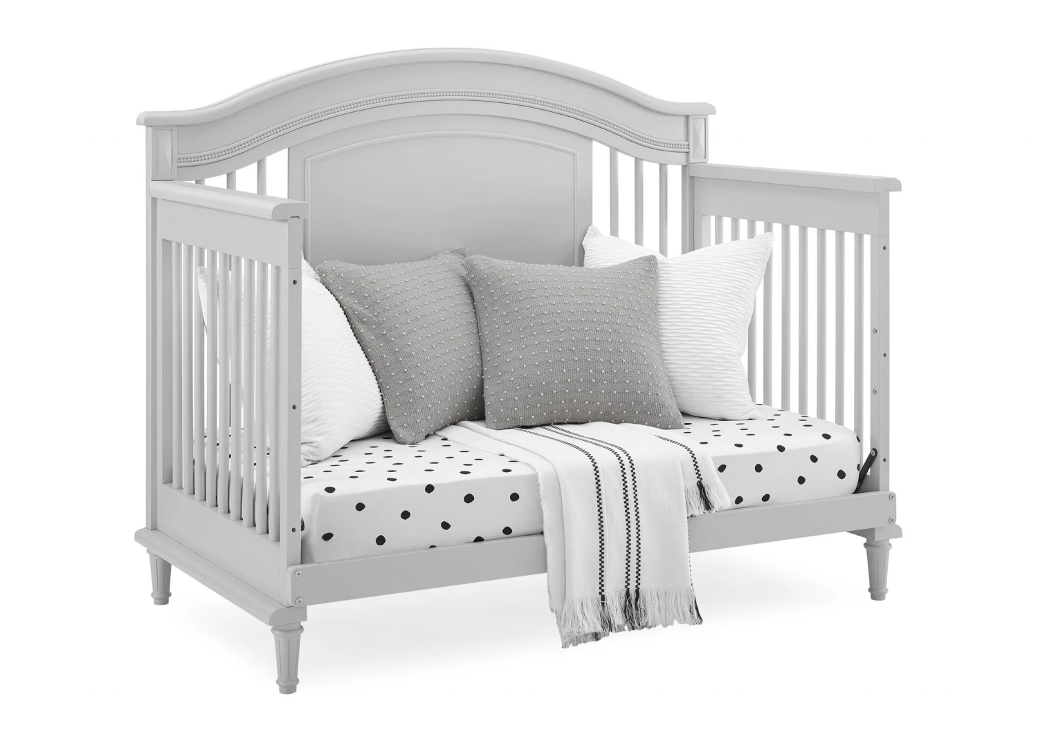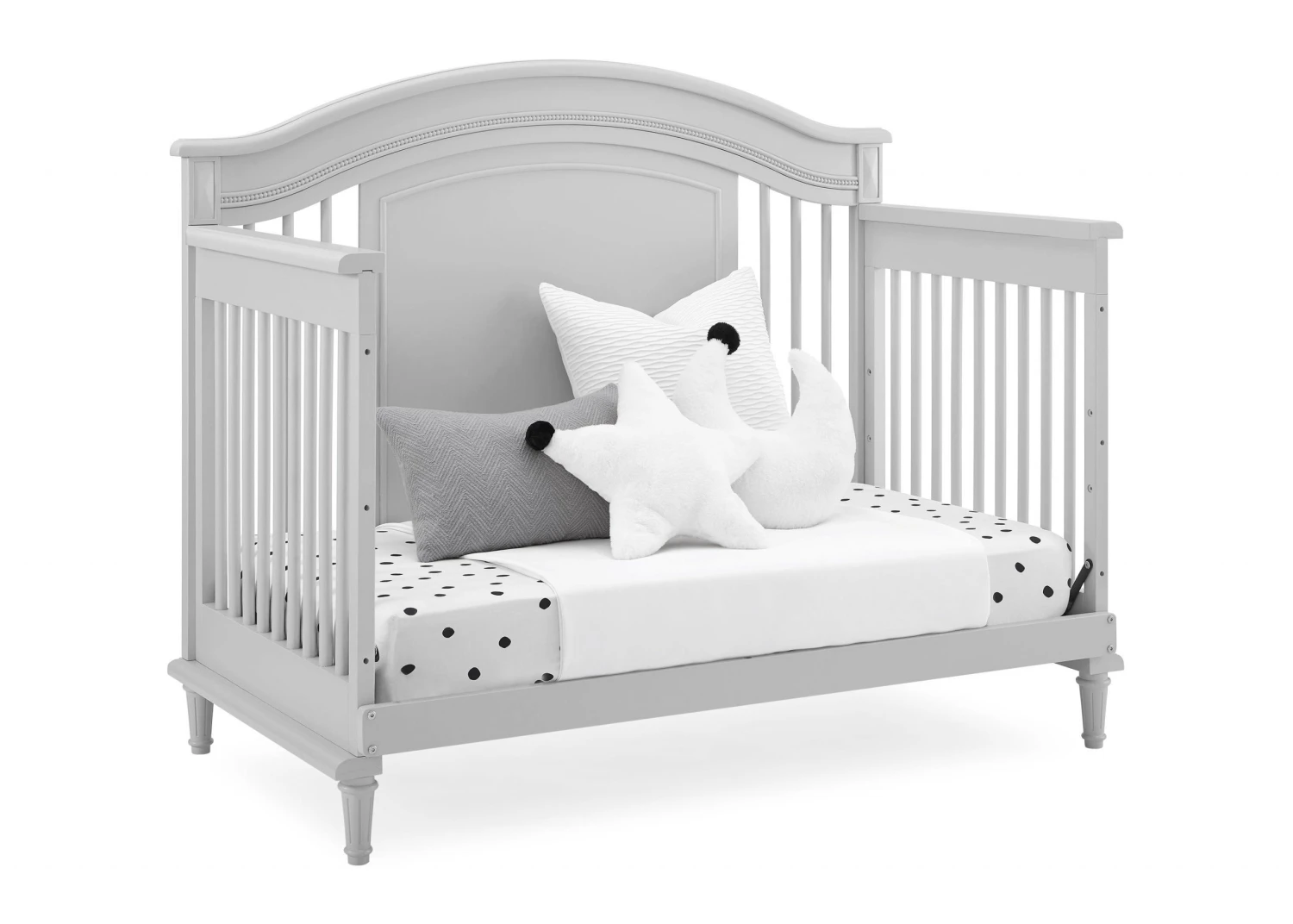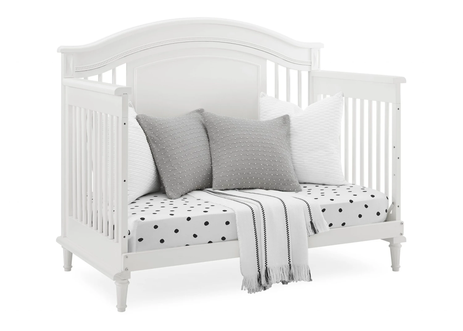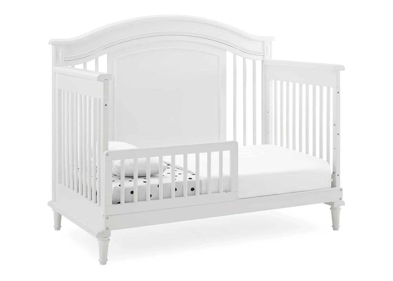 Elegant spindles, gorgeous molding and fluted legs with intricate carvings give the Juliette 6-in-1 Convertible Crib by Simmons Kids a sophisticated look. This crib’s grow-with-me design features three adjustable height levels that allow the crib to be lowered as your child grows, plus it converts from a crib, to a toddler bed, sofa, daybed, full size bed with headboard or full size bed with headboard and footboard. The only bed your little one will ever need, this versatile crib will take you from the nursery to high school, and all the years in between. Toddler Guardrail included; Full Size Bed Rails sold separately. To complete your nursery, pair with the coordinating Juliette 6 Drawer Dresser with Changing Top.