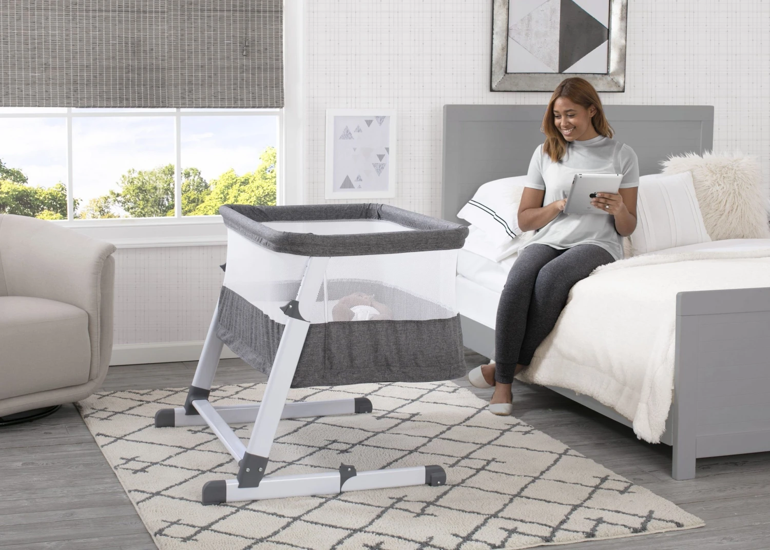 The Room2Grow Convertible Bassinet/Sleeper; For Babies up to 1 Year! from Simmons Kids® is there for your baby as they grow. Making it extremely easy and safe to room share with your little one from birth to 12 months, this newborn bassinet and infant sleeper combo features two stages that allow you to lower the unit as your baby matures. Use the bassinet mode for newborns (up to 15 lbs.) In the bassinet stage you can easily adjust the height so your baby is close by and within reach, which makes it easier than ever to soothe or feed your little one. For infants (up to 25 lbs.) use the sleeper mode. The sleeper mode allows you to lower the unit to the floor to ensure your growing baby has the safest sleep environment while still being near by. The included mattress pad offers a firm, comfortable surface to sleep on while mesh sides provide a clear view of Baby and help air circulate. A must-have for new parents, the Room2Grow Convertible Bassinet/Sleeper; For Babies up to 1 Year! helps make the first year with your baby stress-free by providing a safe room-sharing option for your family. The removable mattress cover is machine washable for easy cleanup.