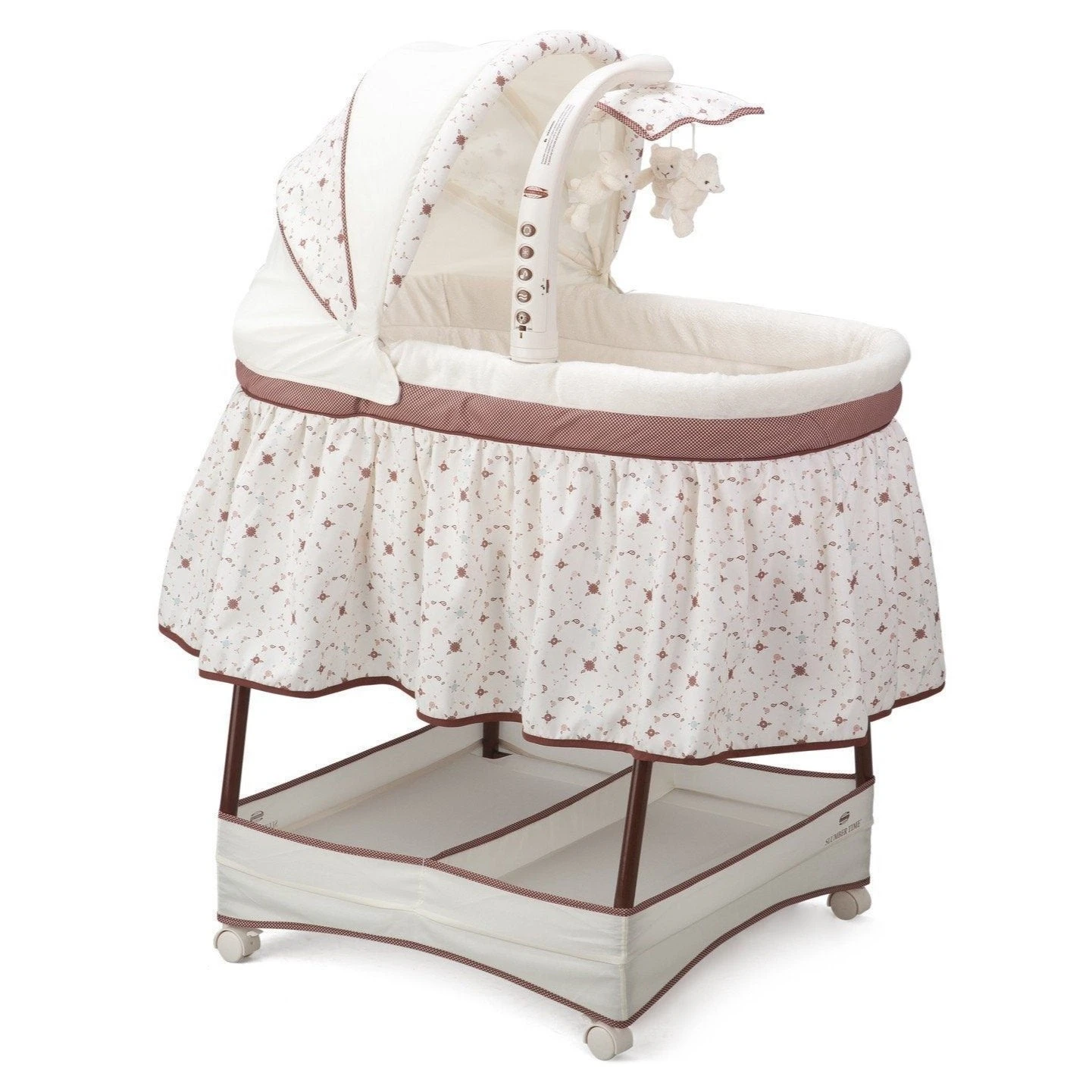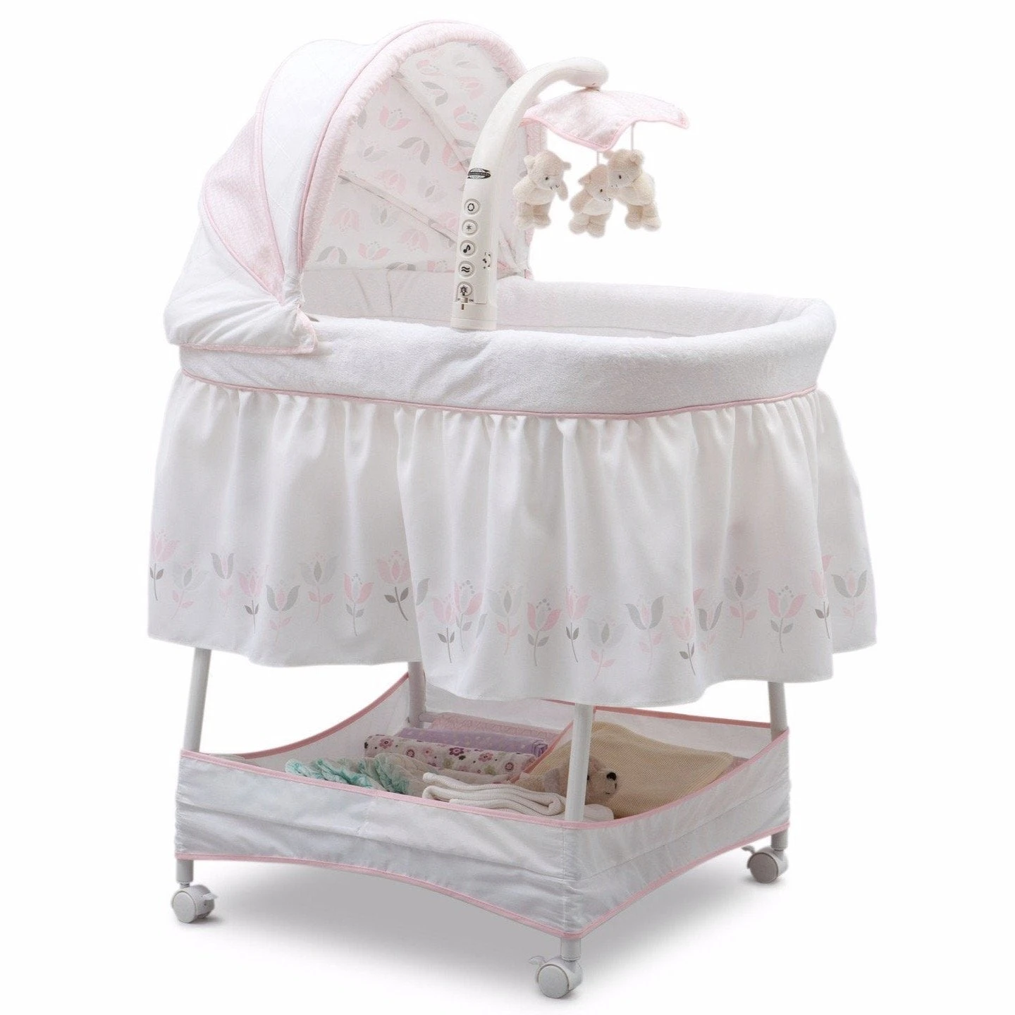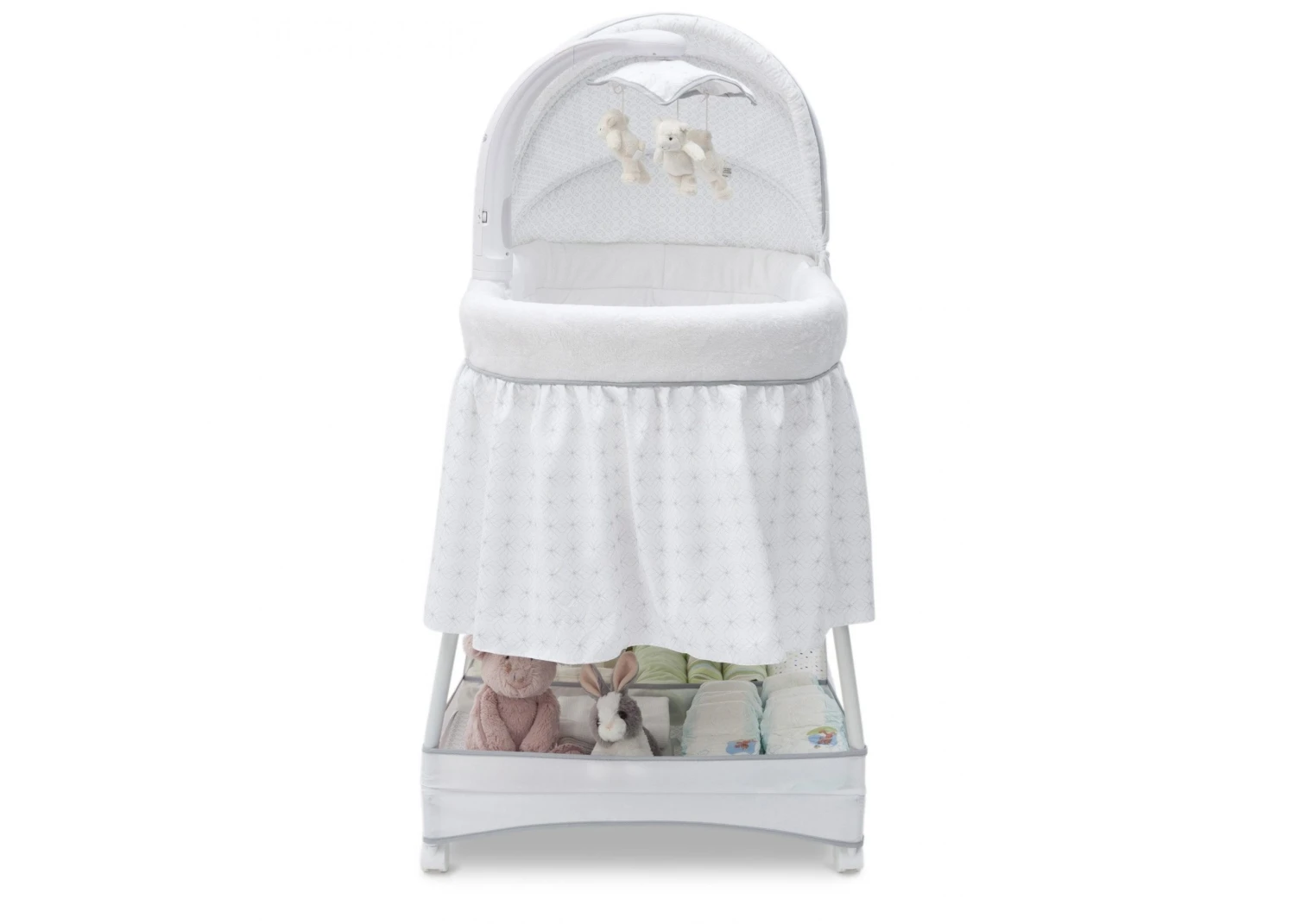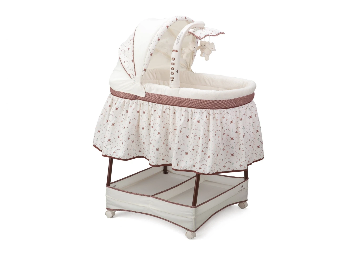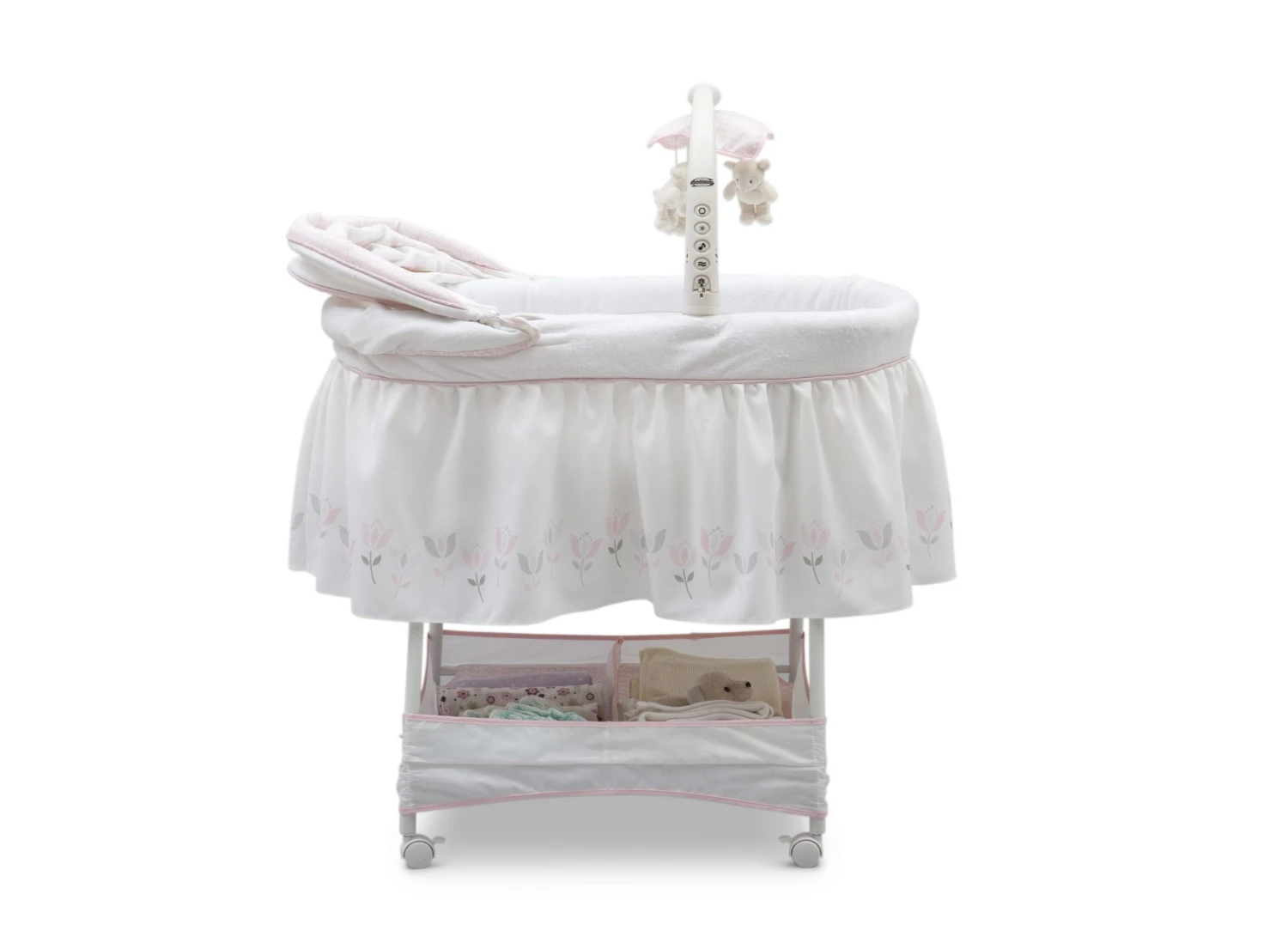 Keep your baby close in the safest way with Simmons Kids® Slumber Time Elite Gliding Bassinet! Outfitted with a soothing side-to-side rocking motion and an electronic mobile that lulls little ones to sleep, this cozy bassinet also features spinning lamb toys, variable speed vibration, calming nightlight, relaxing music and a storage basket underneath.