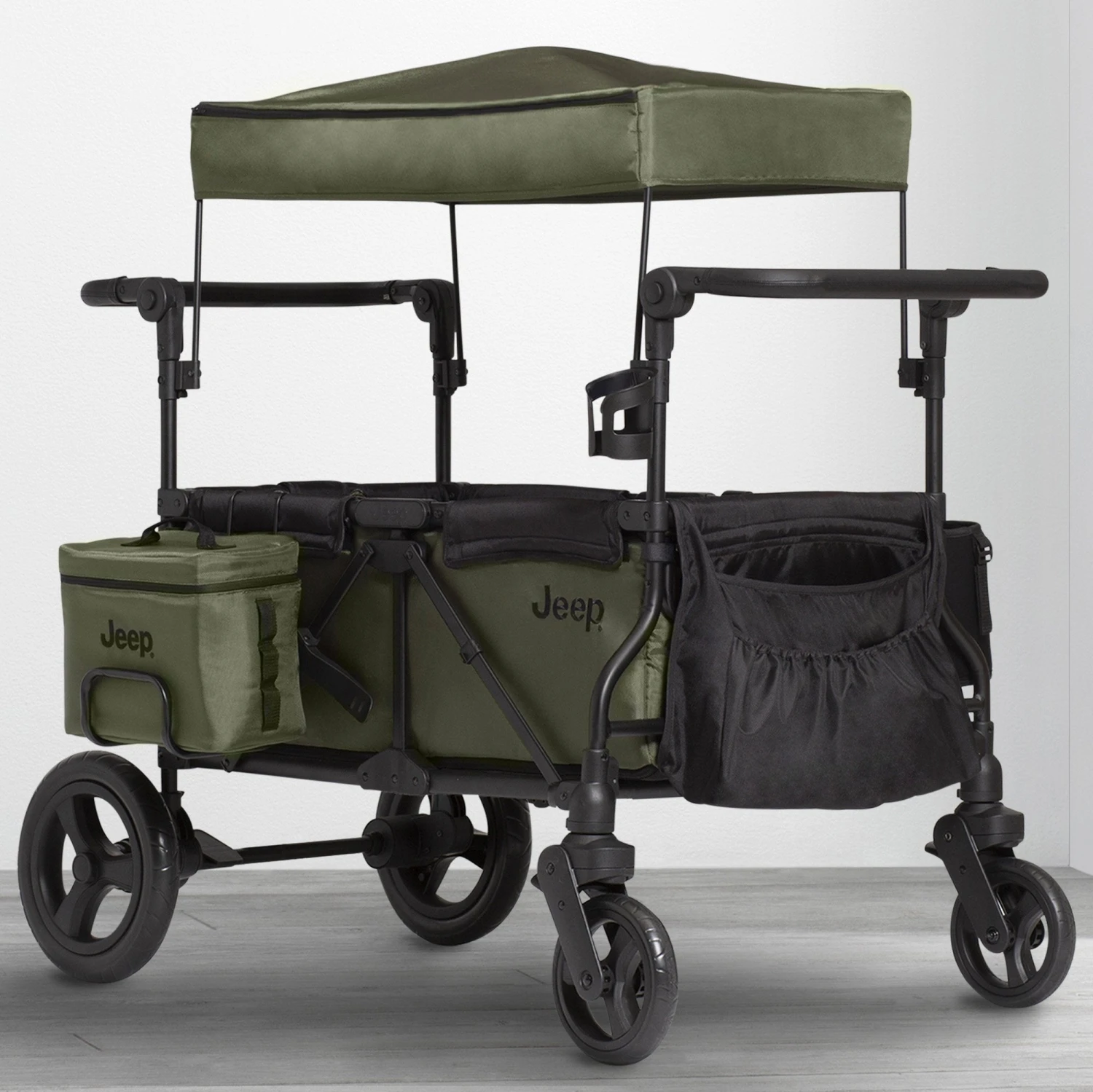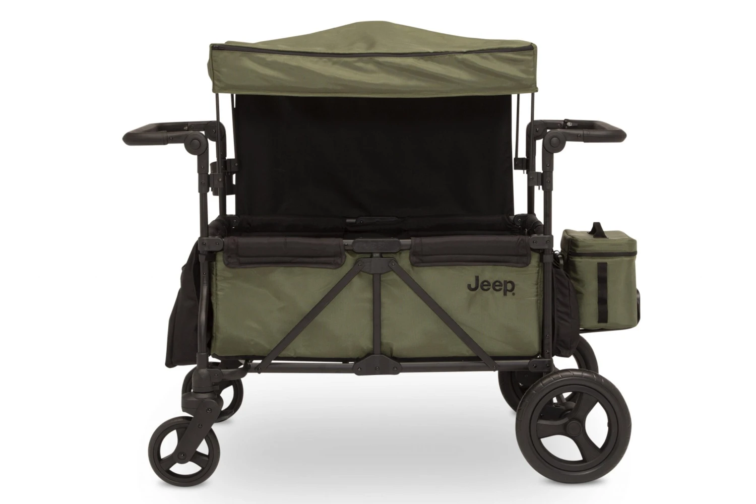 The Jeep Deluxe Wrangler Stroller Wagon with Cooler Bag and Parent Organizer by Delta Children is ready to tackle any family adventure. Designed with all the conveniences of a double stroller and the rugged durability of a wagon, it’s a super-fun crossover that makes any outing easy—take it to the park, beach or sporting event. With so many ways to ride, it’s ideal for kids of varying ages. Attach your current infant car seat with the included adapter for babies or use the two seats with 5-point safety harnesses to securely transport older siblings, twins or friends. The UV blocking canopy protects little ones from the sun while pull-down shades block additional light during naptime. Remove the canopy for open-air cruising. Equipped with more storage than the average stroller, this wagon comes with a removable cooler bag, parent organizer, cup holder and multiple storage pockets to keep all your must-have travel gear on-hand. This wagon is the most off-road capable option ever thanks to its all-terrain puncture proof airless tires. Easy to maneuver, swivel front wheels allow you to turn and pivot, and you can push or pull the wagon with the two adjustable leatherette handlebars. To store or transport, the Jeep Deluxe Wrangler Stroller Wagon by Delta Children features a compact fold and quick release back wheels which make it easier to fit tight spaces. And when your children outgrow the need for a stroller/wagon, use it to haul your own gear at the farmers market, while gardening or the grocery store. Holds up to 110 lbs. Weighs 46.2 lbs.